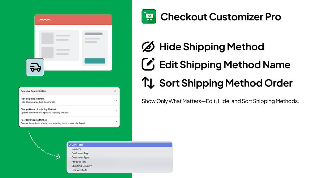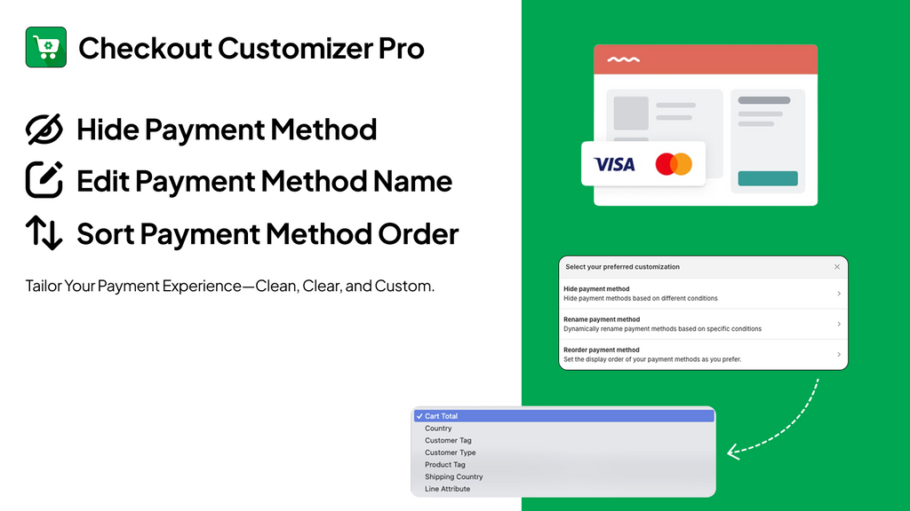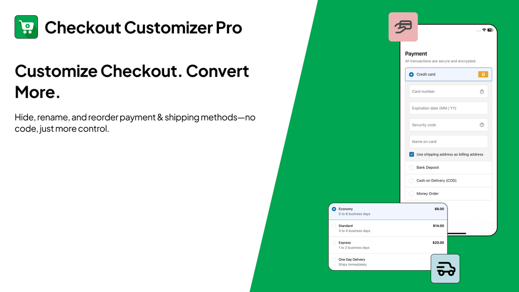 Streamline your checkout—hide, rename, or reorder payment and shipping methods based on cart, location & more. No code needed.