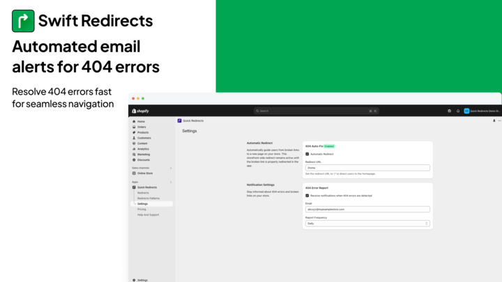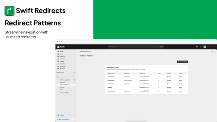 Swift Redirects (by SellioApps) is a free Shopify app that helps merchants automatically detect and fix 404 errors, manage 301 redirects, and create wildcard patterns to prevent broken links at scale. It’s designed to protect your store’s SEO, reduce bounce rates, and ensure a seamless customer experience—even during migrations or site restructuring.